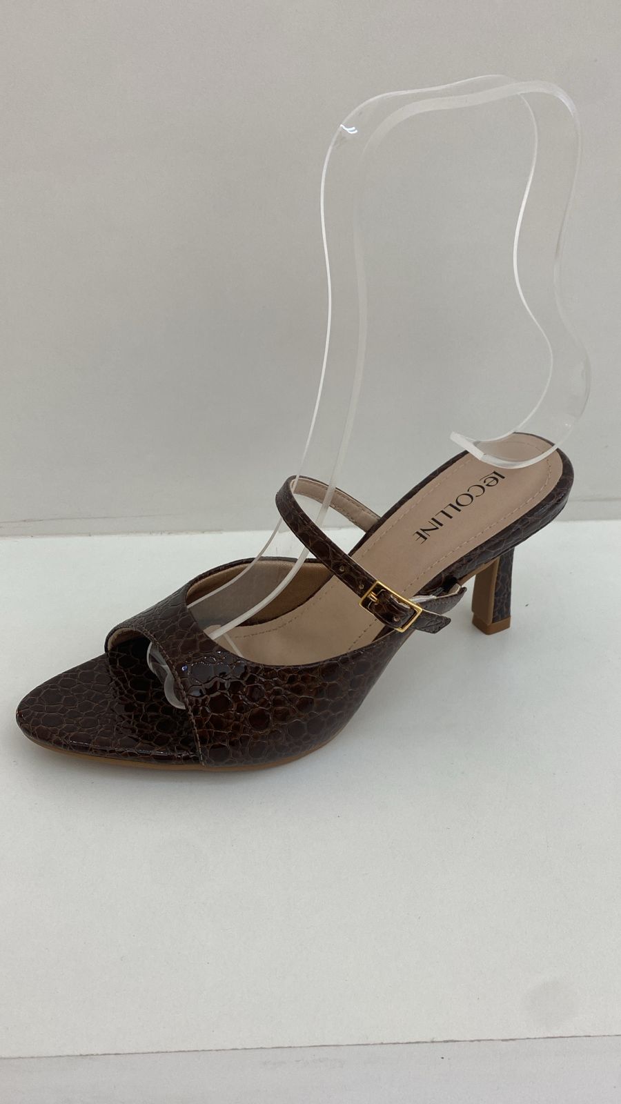 Open mule salto fino. Bico folha. Tira com fivela e regulagem.