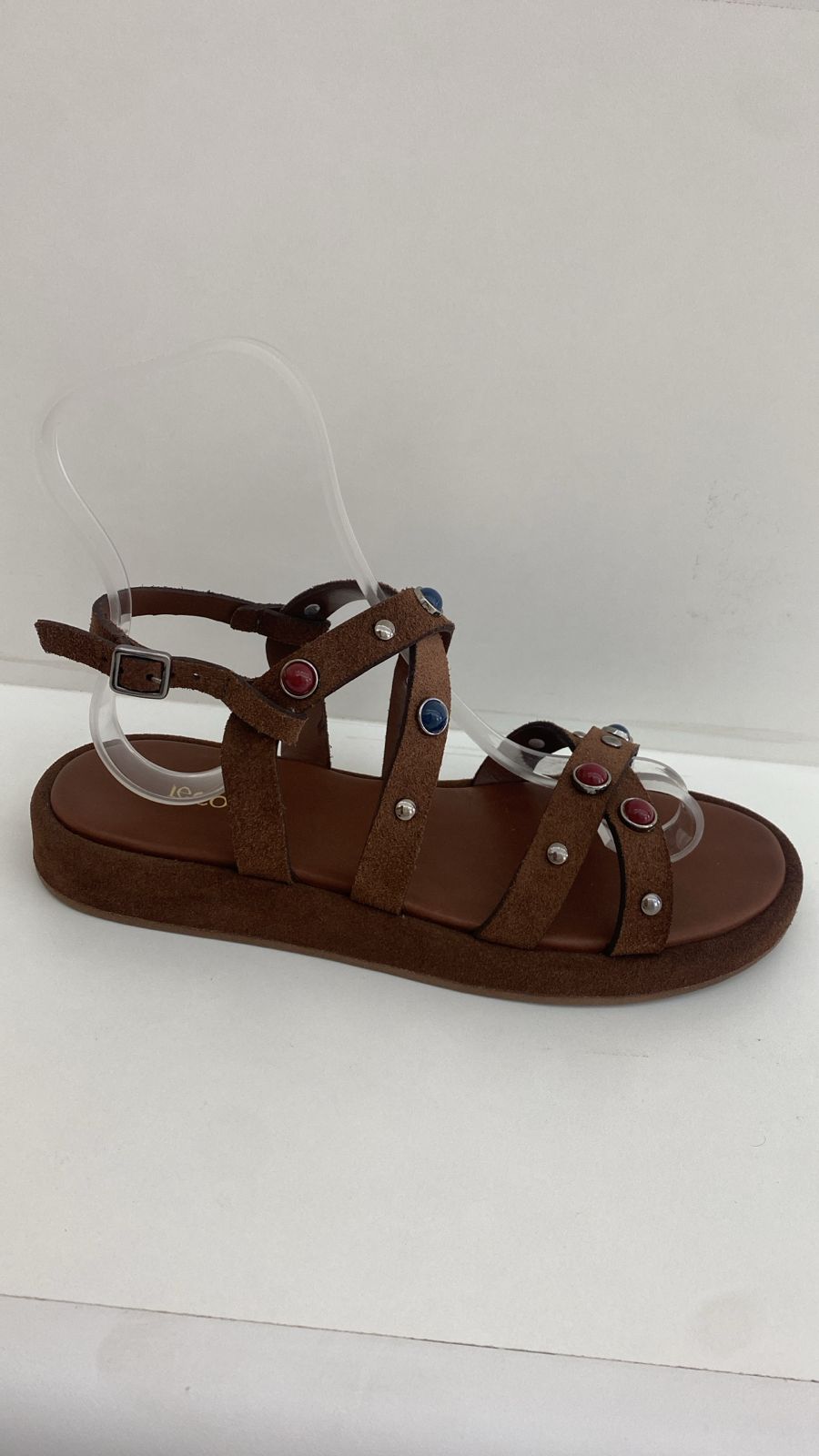 Em camurça com aplicações de esferas com contornos no banho prata nas cores azul marinho e vermelho.