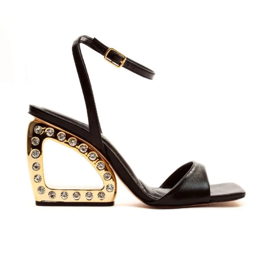 Sandália elegante, com salto espelhado triangular com aplicações de strass, fashionista, confortável.