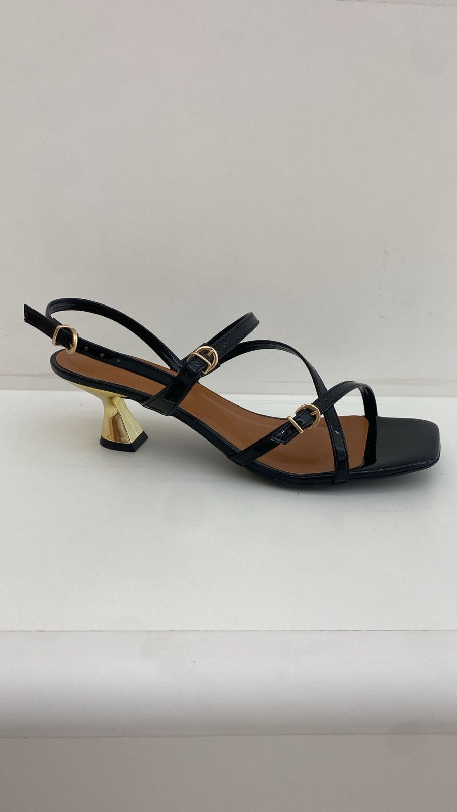 Sandália com salto cromado e em verniz. Tiras e fivelas que permite regulagens.