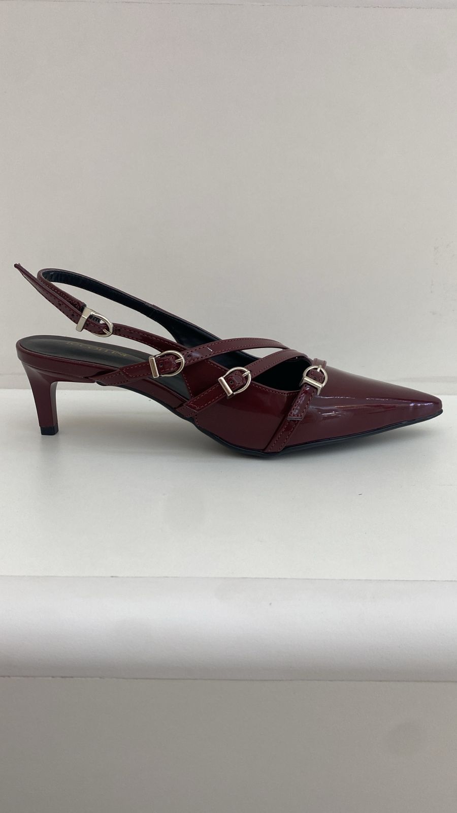 Em verniz, esse slingback une sofisticação e modernidade. Com bico fino alongado e detalhes em tiras com fivelas, é a escolha perfeita para quem busca um calçado versátil, elegante e cheio de personalidade.