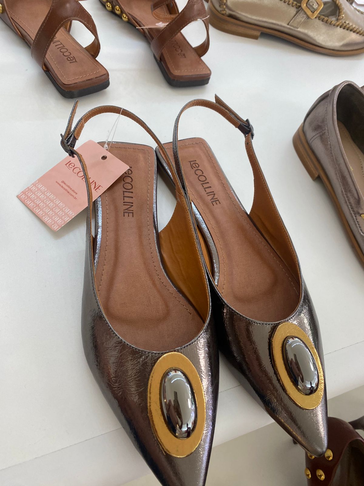 Slingback com bico fino, confeccionado em couro acabamento metalizado em tom onix. Possui detalhe oval sobre o cabedal.