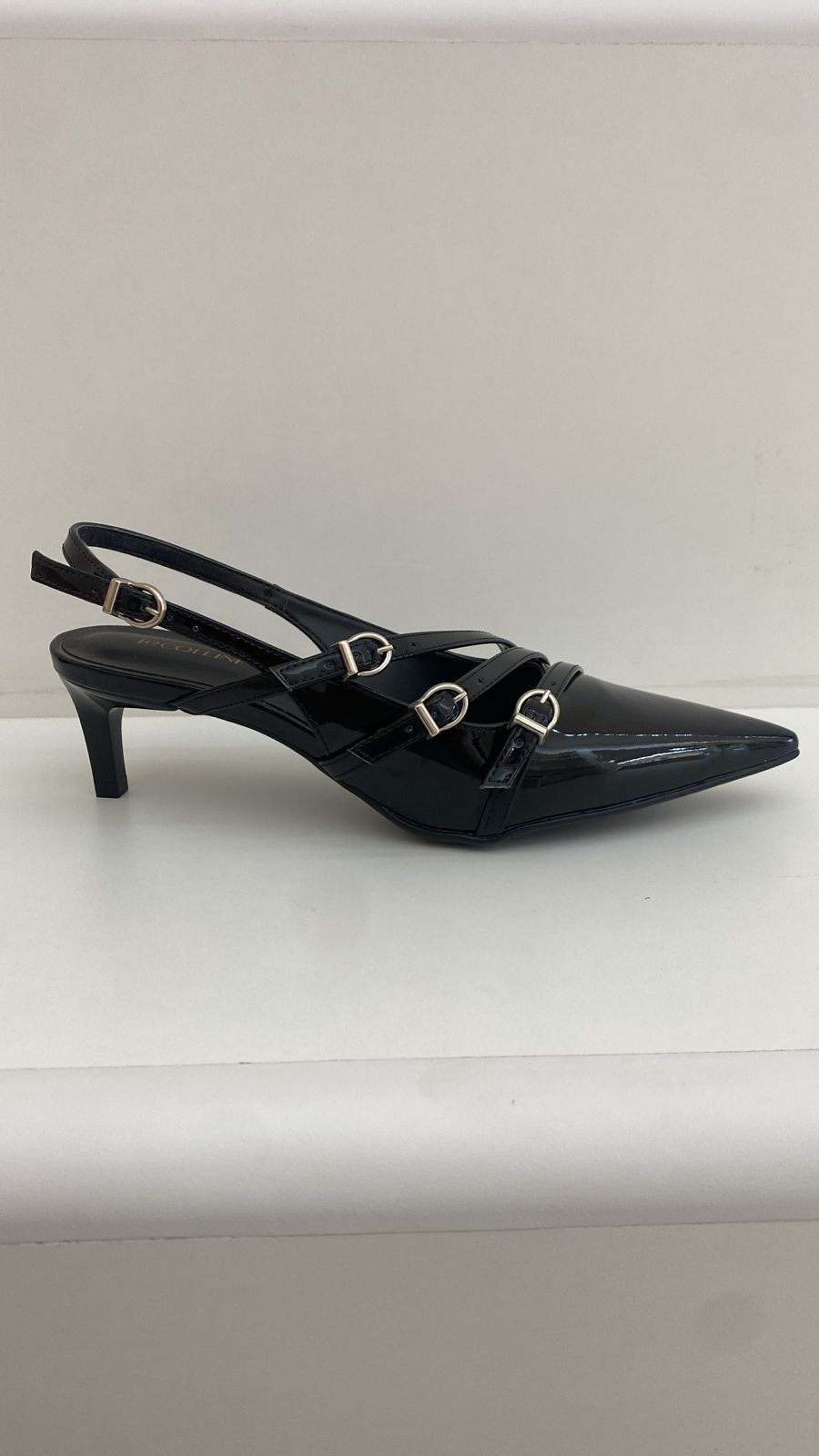 Em verniz, esse slingback une sofisticação e modernidade. Com bico fino alongado e detalhes em tiras com fivelas, é a escolha perfeita para quem busca um calçado versátil, elegante e cheio de personalidade.
